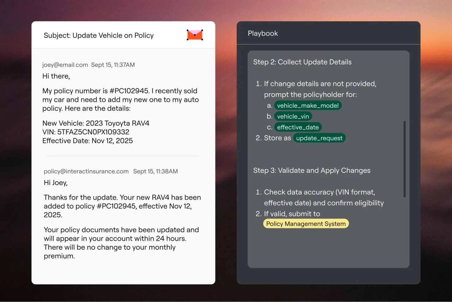 These are high-volume requests that can slow everything down, especially when handled manually. Think of how often a customer asks something like, “How do I add my new car to my policy?”